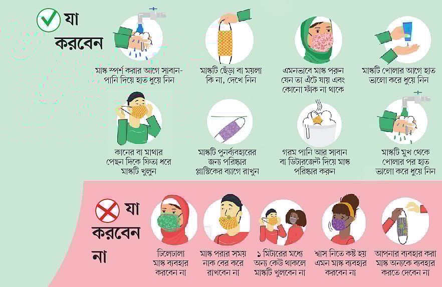 বিশ্বস্বাস্থ্য সংস্থা বলেছে করোনাভাইরাসের সংক্রমণ মোকাবিলায় মাস্ক ব্যবহার জরুরি। এর সঙ্গে যথাযথভাবে মেনে চলতে হবে স্বাস্থ্যবিধির সব নিয়ম। অন্যদের থেকে কমপক্ষে এক মিটার বা তিন ফুট দূরত্ব বজায় রাখতে হবে। বার বার সাবানপানি দিয়ে ভালোভাবে হাত ধুতে হবে। মুখ ও মাস্ক স্পর্শ করা থেকে বিরত থাকতে হবে। মাস্ক ব্যবহারের বিষয়ে বিশ্ব স্বাস্থ্য সংস্থা কিছু পরামর্শ দিয়েছে। একঝলকে দেখে নিন কীভাবে ব্যবহার করবেন মাস্ক।