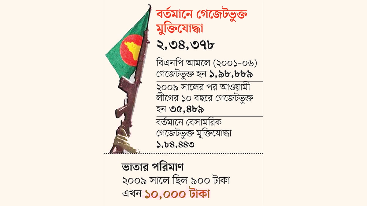 নতুন সরকার এলেই মুক্তিযোদ্ধাদের তালিকা বড় হয়। ৪৭ বছরে ছয়বার মুক্তিযোদ্ধা তালিকা সংযোজন-বিয়োজন হয়েছে। মুক্তিযোদ্ধার বয়স, সংজ্ঞা ও মানদণ্ড পাল্টেছে ১১ বার। আওয়ামী লীগ সরকার ঢাকঢোল পিটিয়ে তালিকা যাচাই-বাছাই শুরু করলেও ব্যাপক অনিয়মের অভিযোগে তা থেমে যায়। কিন্তু এ কাজে খরচ হয়ে গেছে চার কোটি টাকা। এবার ২৬ মার্চ আরেকটি মুক্তিযোদ্ধা তালিকা প্রকাশ করার সিদ্ধান্ত নিয়েছে সরকার। অবশ্য এই তালিকাও অপূর্ণাঙ্গ।