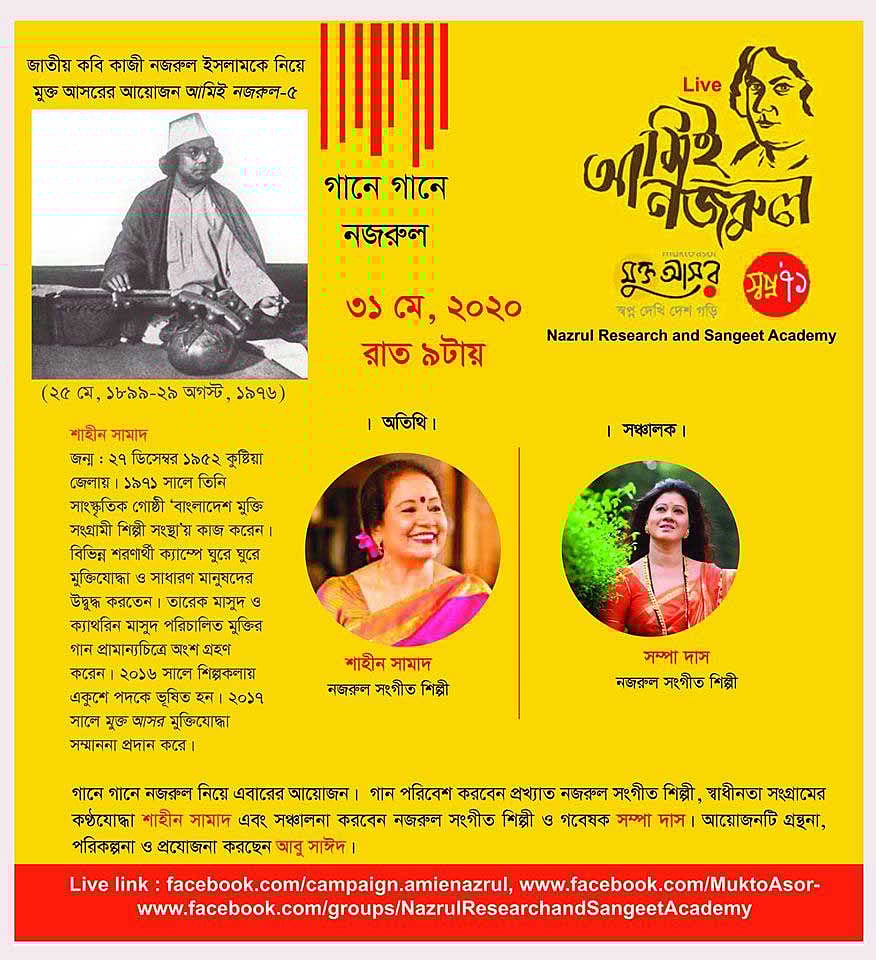 আগামীকাল রোববার আমিই নজরুলের পঞ্চম পর্বে অতিথি হিসেবে থাকবেন প্রখ্যাত নজরুলসংগীতশিল্পী ও স্বাধীনতাসংগ্রামের কণ্ঠযোদ্ধা শাহীন সামাদ। অনুষ্ঠানটি সঞ্চালনা করবেন নজরুলসংগীতশিল্পী ও গবেষক সম্পা দাস।