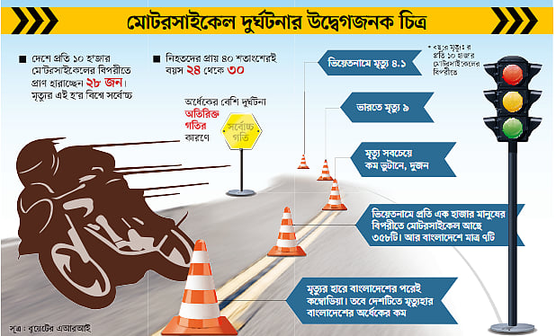 বাংলাদেশ প্রকৌশল বিশ্ববিদালয়ের (বুয়েট) এক গবেষণা বলছে, প্রতিবছর দেশে প্রতি ১০ হাজার মোটরসাইকেলের বিপরীতে দুর্ঘটনায় প্রাণ হারাচ্ছেন ২৮ দশমিক ৪ জন। তাঁদের প্রায় ৪০ শতাংশেরই বয়স ২৪ থেকে ৩০ বছর। মোটরসাইকেল দুর্ঘটনায় মৃত্যুর এই হার সারা বিশ্বে সর্বোচ্চ। যদিও মাথাপিছু মোটরসাইকেল ব্যবহারকারীর হিসাবে বাংলাদেশের অবস্থান সবার পেছনে।