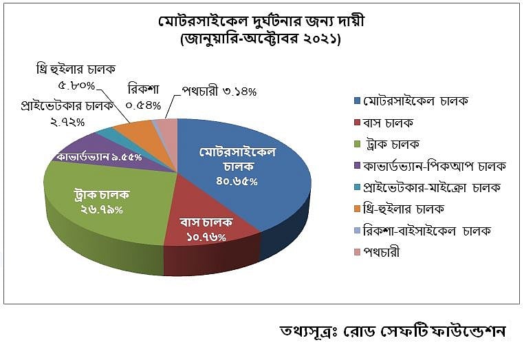 দুর্ঘটনাগুলো বিশ্লেষণ করে দেখা যায়, ৬৭২টি (৪০ দশমিক ৬৫ শতাংশ) দুর্ঘটনার জন্য মোটরসাইকেলচালক এককভাবে দায়ী। বাসচালক দায়ী ১০ দশমিক ৭৬ শতাংশ (১৭৮টি দুর্ঘটনা), ট্রাকচালক ২৬ দশমিক ৭৯ শতাংশ (৪৪৩টি দুর্ঘটনা), কাভার্ড ভ্যান, পিকআপ, ট্রাক্টর, ট্রলি, লরিচালক ৯ দশমিক ৫৫ শতাংশ (১৫৮টি দুর্ঘটনা), প্রাইভেট কার ও মাইক্রোবাসচালক ২ দশমিক ৭২ শতাংশ (৪৫টি দুর্ঘটনা), থ্রি-হুইলার (ইজিবাইক, অটোরিকশা, অটোভ্যান, নছিমন, ভটভটি ও টমটম) চালক ৫ দশমিক ৮০ শতাংশ (৯৬টি দুর্ঘটনা), প্যাডেল রিকশা ও বাইসাইকেলচালক শূন্য দশমিক ৫৪ শতাংশ (৯টি দুর্ঘটনা) ও পথচারী দায়ী ৩ দশমিক ১৪ শতাংশ (৫২টি দুর্ঘটনা)।
