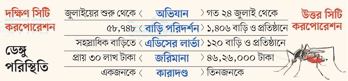 রাজধানীতে ডেঙ্গুর প্রাদুর্ভাব দেখা দেওয়ার পর গত জুলাই থেকে বাসাবাড়িতে অভিযান শুরু করে ঢাকা দক্ষিণ সিটি করপোরেশন (ডিএসসিসি)। ডিএসসিসির পক্ষ থেকে গতকাল পর্যন্ত ৫৮ হাজার ৭৪৮ বাড়ি পরিদর্শন করা হয়েছে। এগুলোর মধ্যে সহস্রাধিক বাড়িতে এডিস মশার লার্ভা পাওয়া যায়। এসব বাড়ি থেকে প্রায় ৩০ লাখ টাকা জরিমানা আদায় এবং একজনকে সাত দিনের কারাদণ্ড দেওয়া হয়েছে।