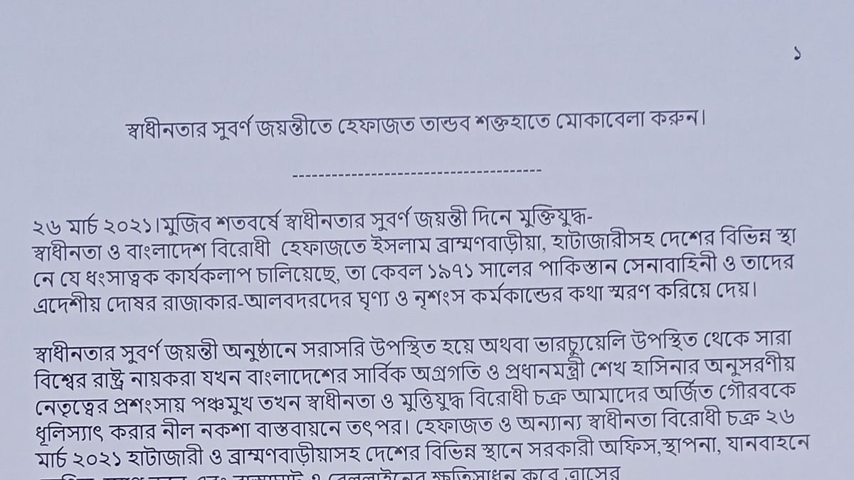 বিবৃতিতে বলা হয়েছে, গত ২৬ মার্চ মুজিব শতবর্ষে স্বাধীনতার সুবর্ণজয়ন্তীর দিনে হেফাজতে ইসলাম ব্রাহ্মণবাড়িয়া, হাটহাজারীসহ দেশের বিভিন্ন স্থানে যে ধ্বংসাত্মক কার্যকলাপ চালিয়েছে, তা কেবল ১৯৭১ সালের পাকিস্তান সেনাবাহিনী ও তাদের এদেশীয় দোসর রাজাকার-আলবদরদের ঘৃণ্য ও নৃশংস কর্মকাণ্ডের কথা স্মরণ করিয়ে দেয়। স্বাধীনতার সুবর্ণজয়ন্তীর অনুষ্ঠানে সরাসরি উপস্থিত হয়ে অথবা ভারচ্যুয়ালি উপস্থিত থেকে সারা বিশ্বের রাষ্ট্রনায়কেরা যখন বাংলাদেশের সার্বিক অগ্রগতি ও প্রধানমন্ত্রী শেখ হাসিনার অনুসরণীয় নেতৃত্বের প্রশংসায় পঞ্চমুখ তখন স্বাধীনতা ও মুক্তিযুদ্ধবিরোধী চক্র আমাদের অর্জিত গৌরবকে ধূলিসাৎ করার নীলনকশা বাস্তবায়নে তৎপর। হেফাজত ও অন্যান্য স্বাধীনতাবিরোধী চক্র ২৬ মার্চ হাটহাজারী ও ব্রাহ্মণবাড়িয়াসহ দেশের বিভিন্ন স্থানে সরকারি অফিস, স্থাপনা, যানবাহনে অগ্নিসংযোগ করে এবং রাস্তাঘাট ও রেললাইনের ক্ষতিসাধন করে ত্রাসের সৃষ্টি করে। এমনকি জাতির পিতা বঙ্গবন্ধু শেখ মুজিবুর রহমানের ম্যুরাল ও প্রতিকৃতি ধ্বংস করার ধৃষ্টতা দেখায়।