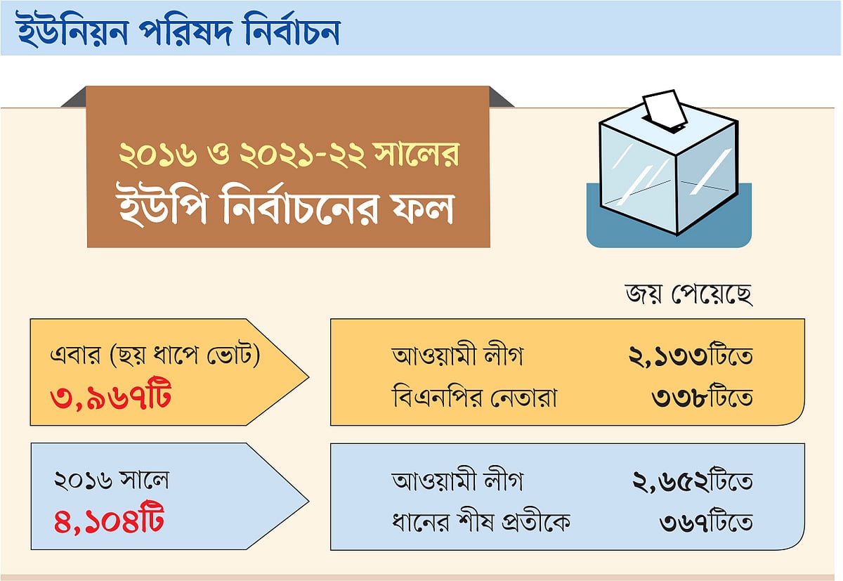 এবার আনুষ্ঠানিকভাবে বিএনপি মাঠে না থাকলেও ক্ষমতাসীন আওয়ামী লীগের জয়ের হার আগের তুলনায় কমেছে। ক্ষমতাসীন আওয়ামী লীগ ছয় ধাপে মোট ২ হাজার ১৩৩টিতে জয় পেয়েছে। এর মধ্যে প্রথম ধাপে ২৬৯, দ্বিতীয় ধাপে ৪৮৫, তৃতীয় ধাপে ৫২৫, চতুর্থ ধাপে ৩৯৬, পঞ্চম ধাপে ৩৪১ ও ষষ্ঠ ধাপে ১১৭টিতে জয় পায়। ছয় ধাপ মিলিয়ে আওয়ামী লীগের জয়ের হার ৫৩ দশমিক ৭৭ শতাংশ। ২০১৬ সালে মোট ৪ হাজার ১০৪টি ইউপির মধ্যে আওয়ামী লীগ ২ হাজার ৬৫২টি, অর্থাৎ প্রায় ৬৫ শতাংশ ইউপিতে জয় পেয়েছিল।