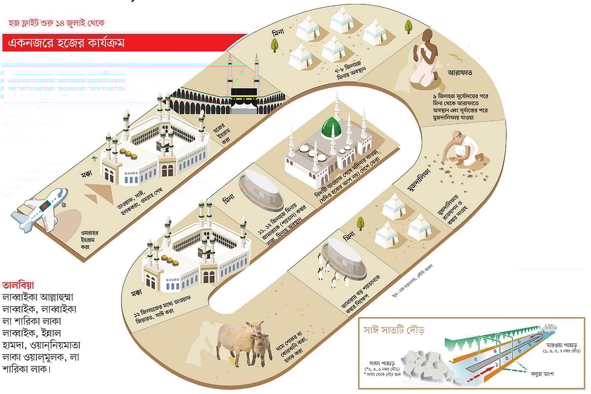 হজের নিয়মকানুন জানতে প্রয়োজনীয় বইপুস্তক পড়ুন। প্রথম আলো হজ গাইড সংগ্রহ করতে পারবেন হজ ক্যাম্প অথবা প্রথম আলো কার্যালয় থেকে। www.prothom-alo.com/hajj থেকেও ডাউনলোড করতে পারেন।