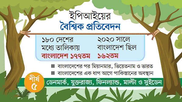 বিশ্ব পরিবেশ সুরক্ষা সূচকে ১৮০টি দেশের মধ্যে বাংলাদেশের অবস্থান ১৭৭। পেছনে রয়েছে কেবল তিন দেশ—মিয়ানমার, ভিয়েতনাম ও ভারত