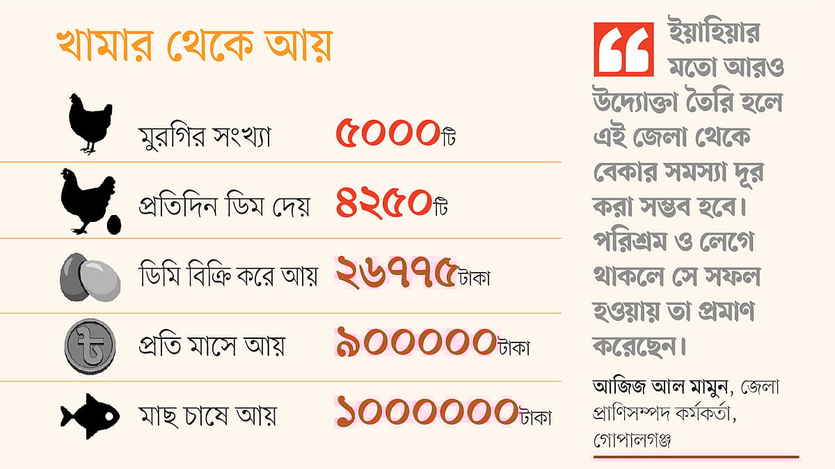 গোপালগঞ্জ জেলা প্রাণিসম্পদ কর্মকর্তা আজিজ আল মামুন বলেন, ‘জেলায় এমন উদ্যোক্তা খুবই কম। ইয়াহিয়ার মতো আরও উদ্যোক্তা তৈরি হলে এই জেলা থেকে বেকার সমস্যা দূর করা সম্ভব হবে।’