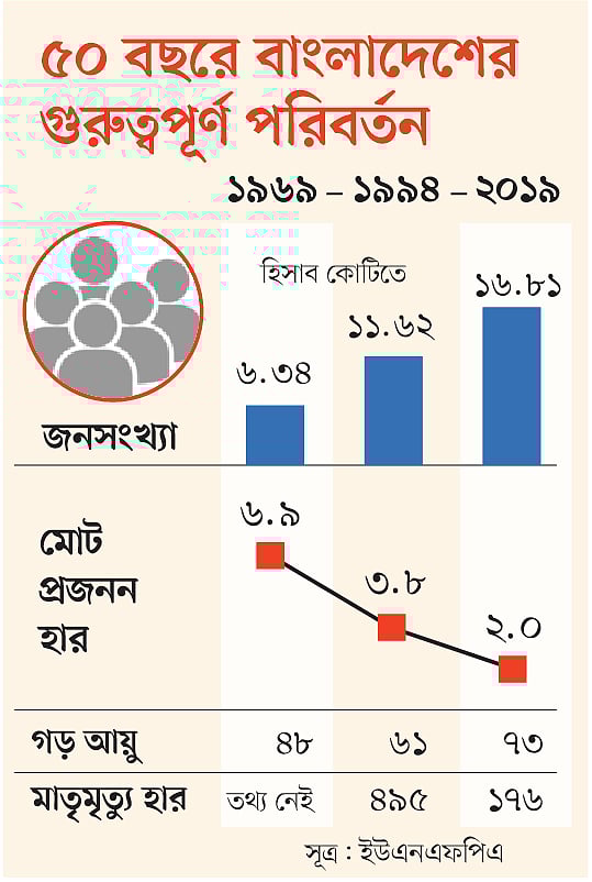 জাতিসংঘ জনসংখ্যা তহবিল (ইউএনএফপিএ) বলছে, ৫০ বছরে দেশের জনসংখ্যা বেড়েছে ১০ কোটি ৪৭ লাখ। বছরে এখন ১.১ শতাংশ হারে জনসংখ্যা বৃদ্ধি পাচ্ছে। দেশের বর্তমান জনসংখ্যা ১৬ কোটি ৮১ লাখ। মানুষের গড় আয়ু ৭৩ বছর।
