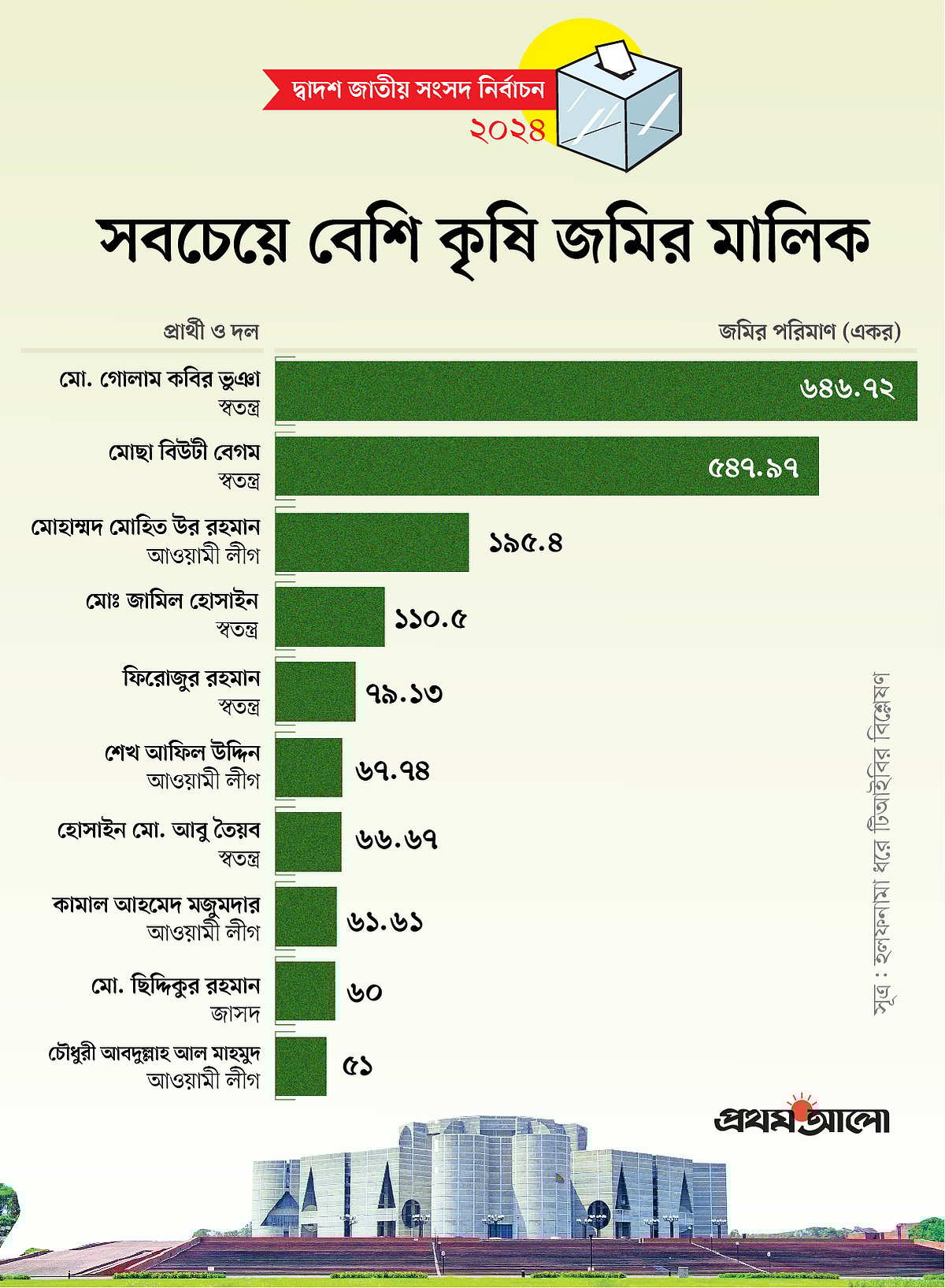 দ্বাদশ জাতীয় সংসদ নির্বাচনে অংশ নেওয়া প্রার্থীদের কেউ কেউ বিপুল পরিমাণ জমির মালিক। কারও বেশি কৃষিজমি, কারও বেশি অকৃষিজমি।