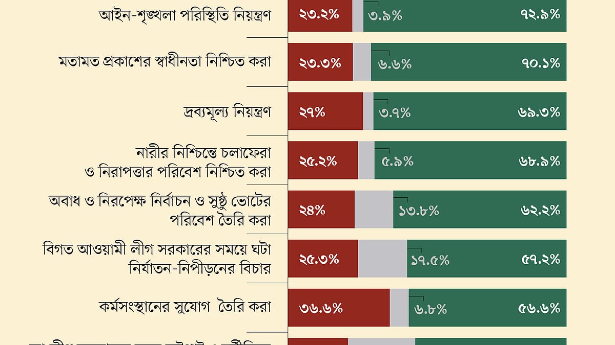 দেশের পরবর্তী নির্বাচিত সরকার আইনশৃঙ্খলা পরিস্থিতি নিয়ন্ত্রণ, মতামত প্রকাশের স্বাধীনতা নিশ্চিতকরণ, দ্রব্যমূল্য নিয়ন্ত্রণসহ বিভিন্ন বিষয়ে সফল হবে বলে মনে করেন অর্ধেকের বেশি মানুষ। নির্বাচিত সরকারের প্রতি মানুষের এই আশাবাদের বিষয়টি উঠে এসেছে প্রথম আলোর উদ্যোগে করা এক জরিপের ফলাফলে।