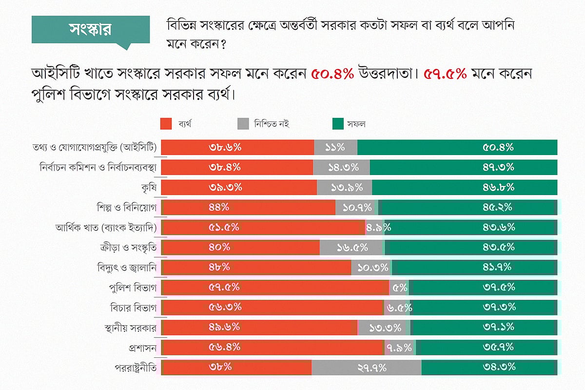 জরিপের তথ্য বলছে, পুলিশ, বিচারব্যবস্থা, প্রশাসন ও আর্থিক খাতের সংস্কারে অন্তর্বর্তী সরকার সফল নয় বলে মনে করেন অর্ধেকের বেশি মানুষ। এ বিষয়ে প্রশ্ন করা হয়েছিল, বিভিন্ন সংস্কারের ক্ষেত্রে অন্তর্বর্তী সরকার কতটা সফল বা ব্যর্থ বলে আপনি মনে করেন? এর জবাবে অর্ধেকের বেশি উত্তরদাতা বলেছেন, পুলিশ (৫৮ শতাংশ), বিচারব্যবস্থা (৫৬ শতাংশ), প্রশাসন (৫৬ শতাংশ) এবং আর্থিক খাত (৫২ শতাংশ) সংস্কারে অন্তর্বর্তী সরকার সফল হয়নি। অর্থাৎ এসব ক্ষেত্রে কাঙ্ক্ষিত সংস্কার এগোয়নি।