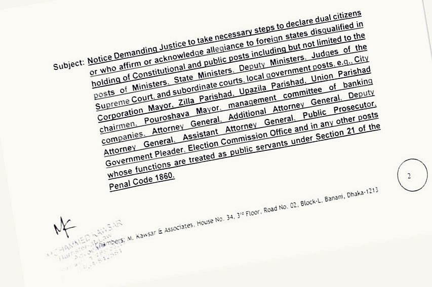 সাংবিধানিক ও সরকারি পদে (পাবলিক পোস্ট) থাকা দ্বৈত নাগরিকের তালিকা তদন্তের মাধ্যমে তৈরি করার পাশাপাশি তাঁদের বিরুদ্ধে যথাযথ ব্যবস্থা নিতে অনুরোধ জানিয়ে আইনি নোটিশ পাঠিয়েছেন সুপ্রিম কোর্টের এক আইনজীবী। দ্বৈত নাগরিকদের নিয়ন্ত্রণ ও তদারকির জন্য একটি টাস্কফোর্স গঠনের অনুরোধও জানানো হয়েছে এতে।