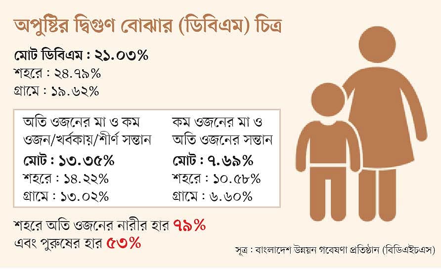 দেশের অনেক পরিবারে এই দুই ধরনের চিত্র দেখা যায়। পুষ্টিবিদেরা এটিকে ডাবল বারডেন অব ম্যালনিউট্রিশন (অপুষ্টির দ্বিগুণ বোঝা) বা ডিবিএম বলেন। কারণ, অতি ওজন বা অতি শীর্ণ মা ও শিশু একটি পরিবারে দ্বিগুণ স্বাস্থ্যঝুঁকি তৈরি করে।