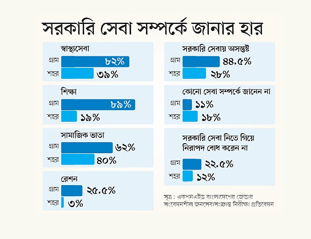জরিপে অংশ নেওয়া ব্যক্তিদের মধ্যে শহরে ১৮ শতাংশ ও গ্রামে ১১ শতাংশ মানুষ সরকারি সেবার বিষয়ে কিছু জানেন না। কোথায় কোন ধরনের সেবা পাওয়া যাবে, সে সম্পর্কে সাধারণ মানুষকে জানাতে সরকারি প্রতিষ্ঠান ও জনপ্রতিনিধিদের উদ্যোগও কম।