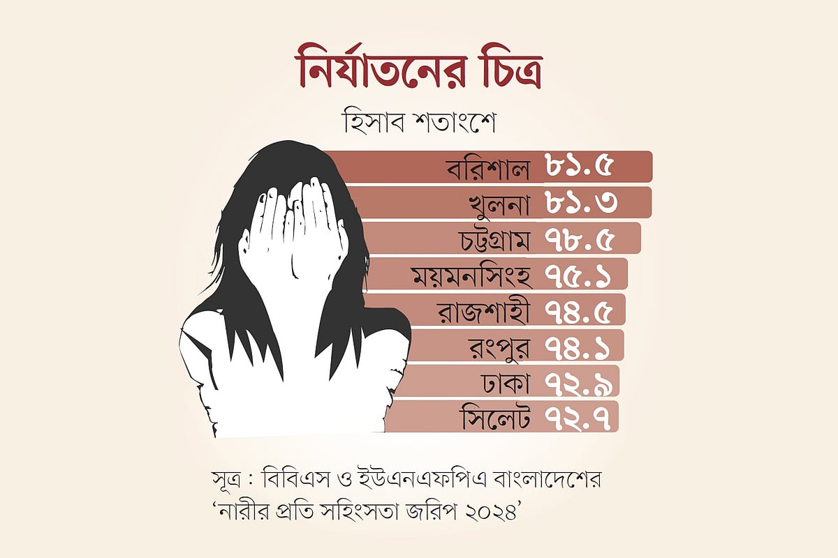 চট্টগ্রামে প্রায় ৭৬ শতাংশ, ময়মনসিংহে ৭৫ শতাংশ, রাজশাহীতে প্রায় ৭৫ শতাংশ এবং রংপুরে ৭৪ শতাংশ নারী সহিংসতার শিকার হয়েছেন।