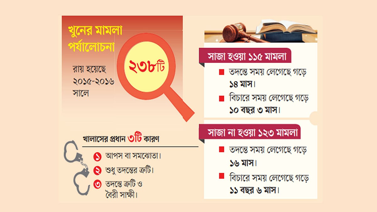 রাজনৈতিক প্রতিপক্ষের হামলা, পারিবারিক বিরোধ, শত্রুতা কিংবা ডাকাতি-ছিনতাই; কারণ যা-ই হোক না কেন, খুনের ঘটনায় করা ৫২ শতাংশ মামলায় আসামিরা খালাস পান। অন্যভাবে বলা যায়, দেশে খুনের ঘটনায় যত মামলা হয়, তার মধ্যে অর্ধেকের বেশি মামলায় শেষ পর্যন্ত আসামিদের কোনো সাজা হয় না।