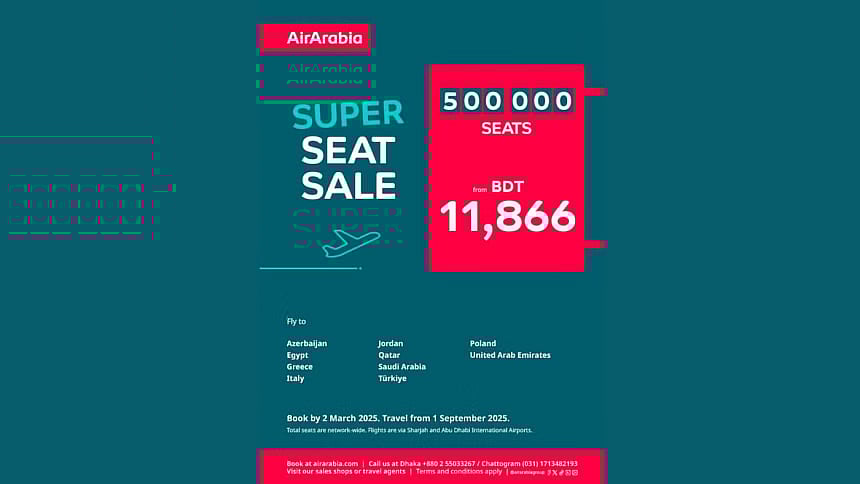 ছাড়মূল্যে ৫ লাখ আসনের টিকিট বিক্রি করবে মধ্যপ্রাচ্য ও উত্তর আফ্রিকাভিত্তিক উড়োজাহাজ পরিবহন সংস্থা এয়ার অ্যারাবিয়া। ‘সুপার সিট সেল’ নামে প্রতিষ্ঠানের প্রচারের একটি উদ্যোগের আওতায় এই সুযোগ দেওয়া হচ্ছে।