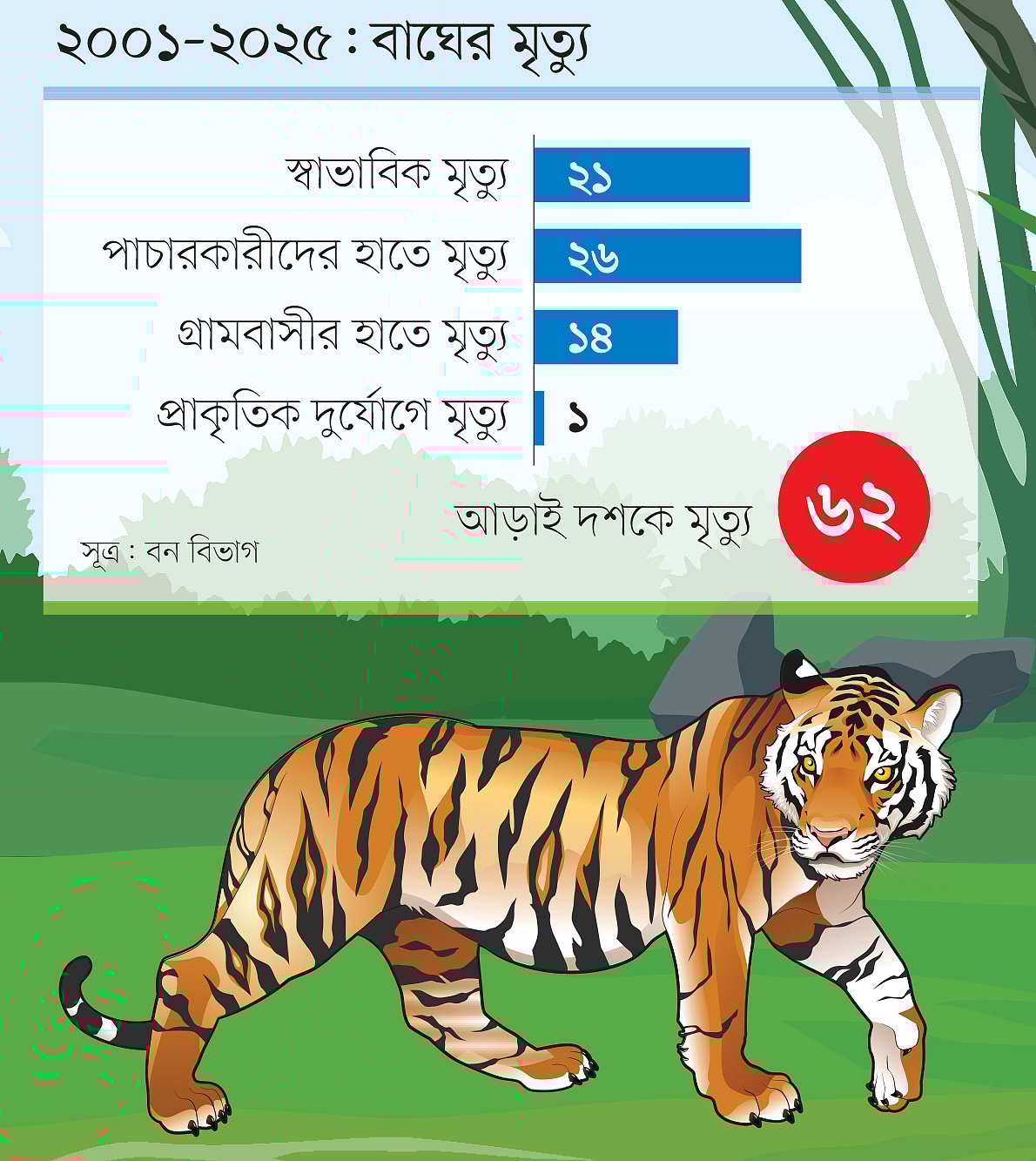বন অধিদপ্তরের তথ্যমতে, গত আড়াই দশকে সব মিলিয়ে মারা যাওয়া বাঘের সংখ্যা ৬২। ২০২৪ সালে সর্বশেষ বাঘ জরিপে সুন্দরবনে বাঘের সংখ্যা ছিল ১২৫, যা আগের জরিপের চেয়ে ১১টি বেশি।