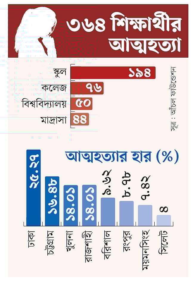 আঁচল ফাউন্ডেশন জানিয়েছে, ৮ মাসে গণমাধ্যমে ৩৬৪ জন শিক্ষার্থীর আত্মহত্যার খবর প্রকাশিত হয়েছে। এর মধ্যে ১৯৪ জন স্কুলশিক্ষার্থী।