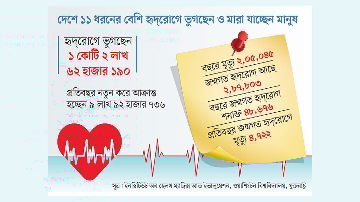 ইনস্টিটিউট অব হেলথ মেট্রিক্স আন্ড ইভালুয়েশনের হিসাব বলছে, বাংলাদেশে হৃদ্যন্ত্রে জন্মগত ত্রুটি থাকা মানুষ আছে ২ লাখ ৮৭ হাজার ৮০৩ জন। প্রতিবছর হৃদ্যন্ত্রে ত্রুটি থাকা শিশু বা বয়স্ক মানুষ শনাক্ত হয় ৪৮ হাজার ৬৭৬ জন। এ ধরনের হৃদ্রোগে প্রতিবছর ৪ হাজার ৭২২ জনের মৃত্যু হচ্ছে।