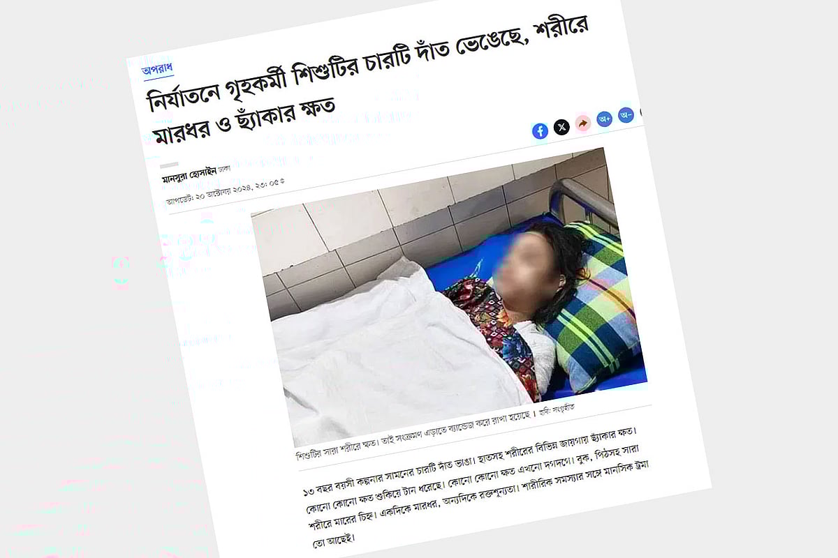গত ২০ অক্টোবর প্রথম আলো অনলাইনে ‘নির্যাতনে গৃহকর্মী শিশুটির চারটি দাঁত ভেঙেছে, শরীরে মারধর ও ছ্যাঁকার ক্ষত’ শিরোনামে একটি প্রতিবেদন প্রকাশিত হয়।
