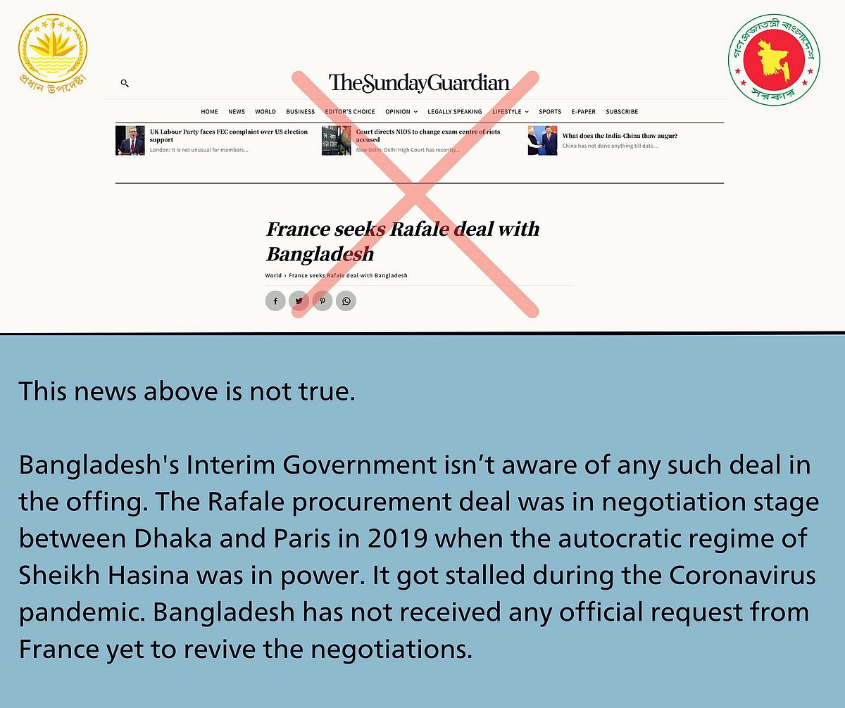 ‘রাফাল যুদ্ধবিমান ক্রয়ে ফ্রান্সের সঙ্গে চুক্তি চায় বাংলাদেশ’ শিরোনামে গতকাল রোববার দ্য সানডে গার্ডিয়ানে একটি প্রতিবেদন প্রকাশিত হয়। এই প্রতিবেদন প্রসঙ্গে ‘প্রধান উপদেষ্টার প্রেস উইং ফ্যাক্টস' নামের ফেসবুক পেজে আজ সোমবার জানানো হয়, প্রকাশিত ওই খবর সত্য নয় এবং অন্তর্বর্তীকালীন সরকার এ ধরনের কোনো চুক্তির সম্ভাবনা সম্পর্কে অবগত নয়।