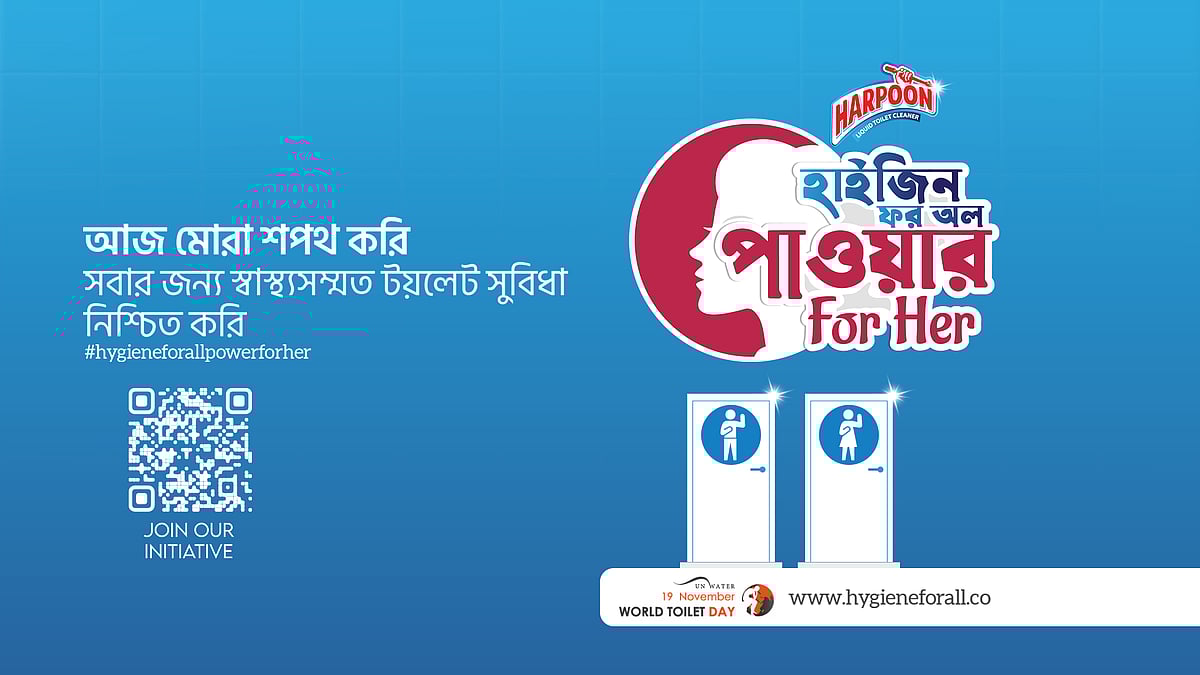 বিশ্ব টয়লেট দিবস উপলক্ষে মানুষকে স্বাস্থ্যসম্মতভাবে টয়লেট ব্যবহারে সচেতন করতে ‘হাইজিন ফর অল, পাওয়ার ফর হার’ ক্যাম্পেইন করছে কাজী এন্টারপ্রাইজেস লিমিটেডের টয়লেট ক্লিনার ব্র্যান্ড হারপুন। এই ক্যাম্পেইনের মূল লক্ষ্য হলো দেশে শতভাগ নারীবান্ধব ও হাইজিনসমৃদ্ধ টয়লেট নিশ্চিতকরণে মানুষকে উদ্বুদ্ধ করা।