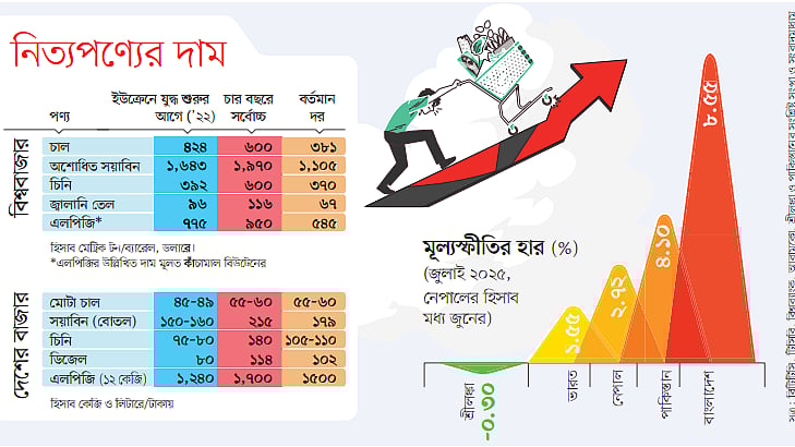ভারতে মূল্যস্ফীতি এখন একেবারেই কম (১ দশমিক ৫৫ শতাংশ)। নেপালেও তাই (২ দশমিক ৭২)। বিপরীতে বাংলাদেশে এখনো মূল্যস্ফীতি চড়া, যা গত জুলাই মাসে ছিল সাড়ে ৮ শতাংশের বেশি।