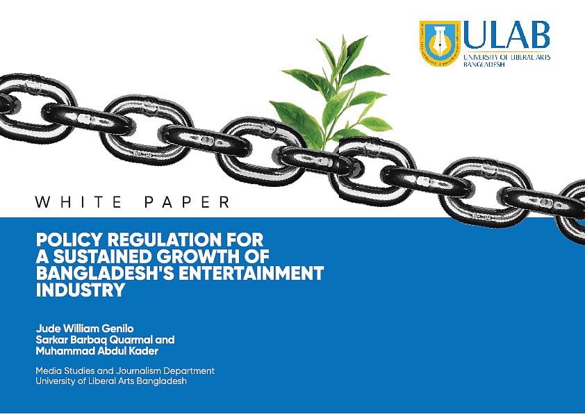 দেশের বিনোদন মাধ্যমের টেকসই উন্নয়নের লক্ষ্যে সরকারি নীতিমালা ও নিয়ন্ত্রণসংক্রান্ত একটি শ্বেতপত্র প্রকাশ করেছে বেসরকারি বিশ্ববিদ্যালয় ইউনিভার্সিটি অব লিবারেল আর্টস বাংলাদেশের (ইউল্যাব) গণমাধ্যম অধ্যয়ন ও সাংবাদিকতা বিভাগ। বিনোদন মাধ্যমের সাম্প্রতিক প্রবণতা এবং এ খাতের বিকাশ ও ব্যবস্থাপনা নিয়ন্ত্রণে সম্ভাব্য কৌশল নিয়ে আলোচনা শ্বেতপত্রের মূল উদ্দেশ্য।