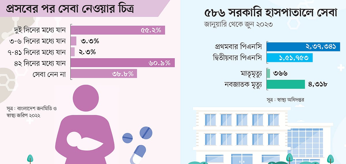 প্রতিবেদনে বলা হয়, সন্তান জন্ম দেওয়ার পর প্রথম দুই দিনে প্রতি ১০০ মায়ের মধ্যে ৪৫ জনই চিকিৎসাসেবা নেন না। প্রসবের দুই দিনের মধ্যে মাত্র ৫৫ শতাংশ মা চিকিৎসকসহ প্রশিক্ষিত সেবাদানকারীর কাছে পিএনসি নেন। ২০১৭-১৮ সালের বিডিএইচএস প্রতিবেদনে এই হার ছিল ৫৩।