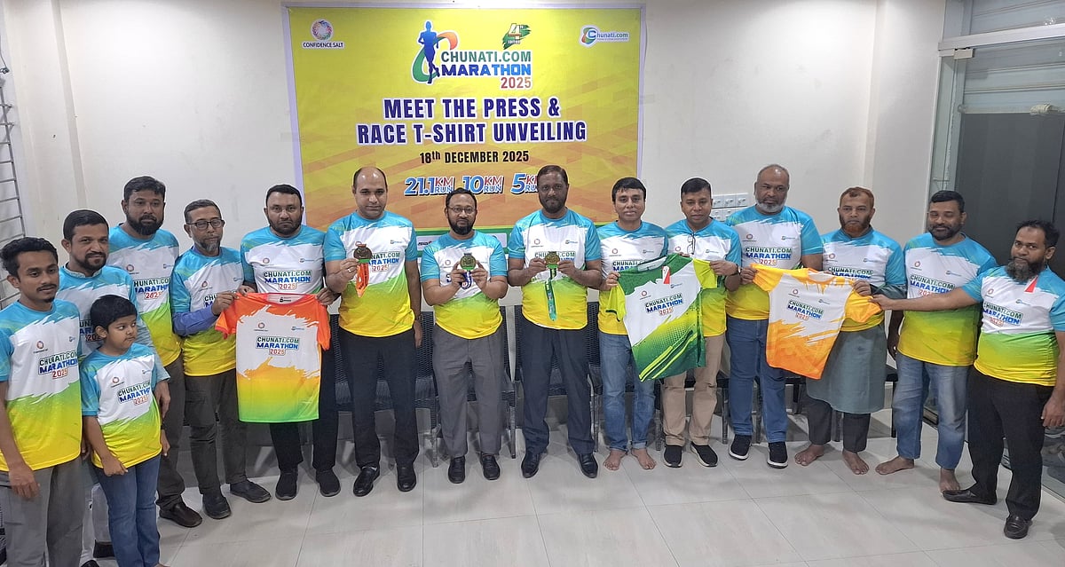 সংবাদ সম্মেলনে চুনতি ডটকম ম্যারাথন ২০২৫–এর মেডেল ও রেস টি-শার্ট আনুষ্ঠানিকভাবে উন্মোচন করা হয়।
