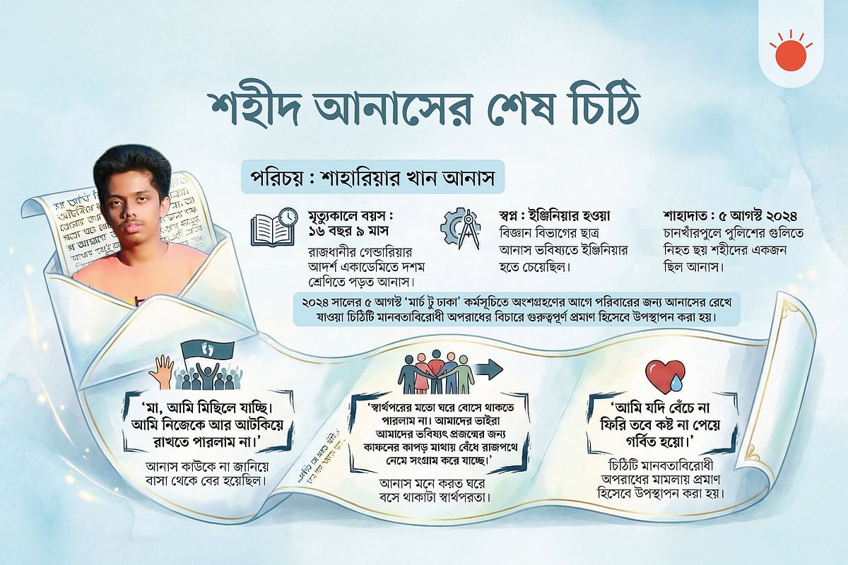 জুলাই গণ-অভ্যুত্থানকালে চানখাঁরপুলে ছয়জনকে হত্যার ঘটনায় মানবতাবিরোধী অপরাধের মামলার বিচারে প্রমাণ হিসেবে আনাসের লেখা চিঠিটি আন্তর্জাতিক অপরাধ ট্রাইব্যুনাল-১-এ উপস্থাপন করে প্রসিকিউশন (রাষ্ট্রপক্ষ)। এ মামলার রায় আজ সোমবার ঘোষণা করা হয়েছে।