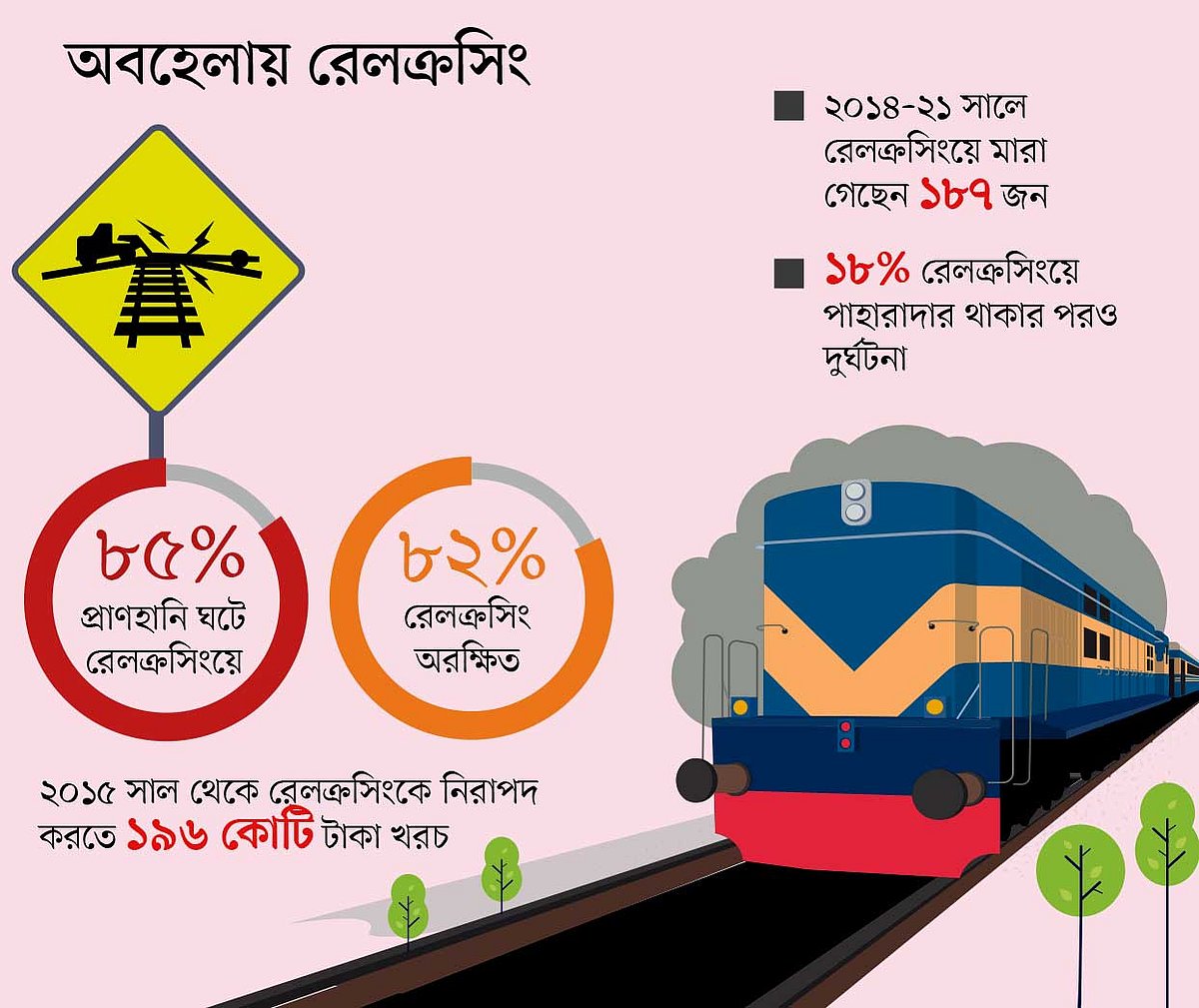 রেলক্রসিংগুলো যেন অবহেলার অপর নাম। সারা দেশে ৮২ শতাংশ রেলক্রসিং অরক্ষিত। অর্থাৎ ট্রেন চলাচলের সময় যানবাহন আটকানোর জন্য কোনো পাহারাদার কিংবা প্রতিবন্ধক কিছুই নেই। বাকি ১৮ শতাংশ ক্রসিংয়ে পাহারাদার ও প্রতিবন্ধক—দুটিই আছে। কিন্তু পাহারাদারের অবহেলায় কিংবা চালকের অসতর্কতায় সেগুলোতেও দুর্ঘটনা ঘটছে।