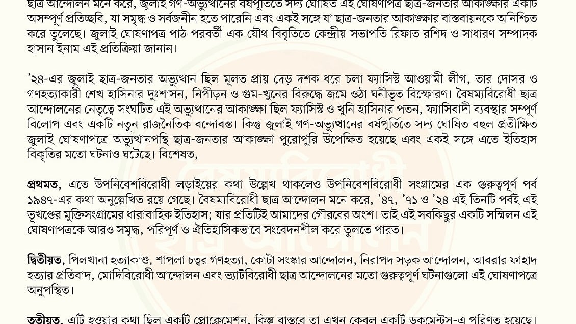 বৈষম্যবিরোধী ছাত্র আন্দোলনের বিবৃতিতে বলা হয়, ২৪-এর জুলাই ছাত্র-জনতার অভ্যুত্থান ছিল মূলত প্রায় দেড় দশক ধরে চলা ফ্যাসিস্ট আওয়ামী লীগ, তার দোসর ও গণহত্যাকারী শেখ হাসিনার দুঃশাসন, নিপীড়ন ও গুম-খুনের বিরুদ্ধে জমে ওঠা ঘনীভূত বিস্ফোরণ। বৈষম্যবিরোধী ছাত্র আন্দোলনের নেতৃত্বে সংঘটিত এই অভ্যুত্থানের আকাঙ্ক্ষা ছিল ফ্যাসিস্ট ও খুনি হাসিনার পতন, ফ্যাসিবাদী ব্যবস্থার সম্পূর্ণ বিলোপ এবং একটি নতুন রাজনৈতিক বন্দোবস্ত। কিন্তু জুলাই গণ-অভ্যুত্থানের বর্ষপূর্তিতে সদ্য ঘোষিত বহুল প্রতীক্ষিত জুলাই ঘোষণাপত্রে অভ্যুত্থানপন্থী ছাত্র-জনতার আকাঙ্ক্ষা পুরোপুরি উপেক্ষিত হয়েছে এবং একই সঙ্গে এতে ইতিহাস বিকৃতির মতো ঘটনাও ঘটেছে।