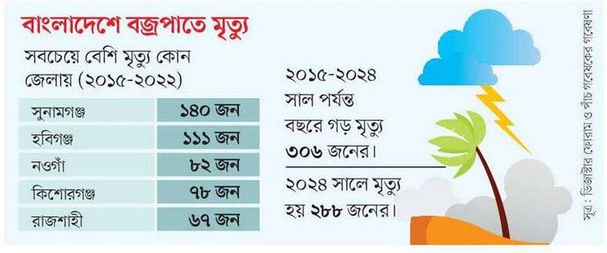 খারাতুন সেসব বিধবার একজন, যাঁরা হাওরে বজ্রপাতে স্বামী হারিয়েছেন। বেসরকারি সংস্থা ডিজাস্টার ফোরামের হিসাবে, ২০১৪ থেকে ২০২৪ সাল পর্যন্ত দেশে বজ্রপাতে ৩ হাজার ৬০ জন নিহত হয়েছেন। বছরে গড়ে মৃত্যু ৩০৬ জনের। মানে প্রায় প্রতিদিন একজন। ২০২৪ সালে নিহত হন ২৮৮ জন। এর মধ্যে নারী ও শিশু ৮১ জন। পুরুষ ২০৭ জন।