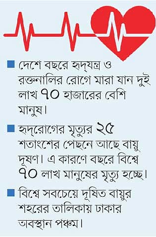 দেশে মৃত্যুর শীর্ষ কারণগুলোর অন্যমত হৃদ্যন্ত্র ও রক্তনালির রোগ বা কার্ডিওভাস্কুলার ডিজিজ। একটি পরিসংখ্যান বলছে, দেশে মোট মৃত্যুর ৩৪ শতাংশের পেছনে আছে হৃদ্যন্ত্র ও রক্তনালির রোগ। এত দিন বলা হয়েছে, অস্বাস্থ্যকর খাদ্য ও কায়িক পরিশ্রমহীন জীবনযাপন হৃদ্রোগের ঝুঁকি বাড়ায়। এখন বিজ্ঞানীরা বলছেন, বায়ুদূষণ এই রোগের প্রকোপ বাড়াচ্ছে।