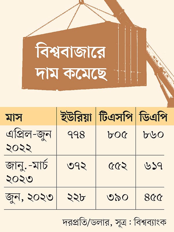 বিশ্ববাজারে সারের দাম ব্যাপকভাবে কমেছে। বিশ্বব্যাংকের পণ্যের মূল্যতালিকা অনুযায়ী, গত বছর এপ্রিল-জুন সময়ে ইউরোপে সরবরাহের ক্ষেত্রে ইউরিয়া সারের টনপ্রতি গড় দর ছিল ৭৭৪ ডলার, যা গত জুনে ২৮৮ ডলারে নামে। একই সময়ে ডিএপি সারের দাম টনপ্রতি ৮৬০ ডলার থেকে কমে ৪৫৫ ডলারে নেমেছে। আর টিএসপি সারের দাম টনপ্রতি ৮০৫ ডলার থেকে কমে হয়েছে ৩৯০ ডলার।