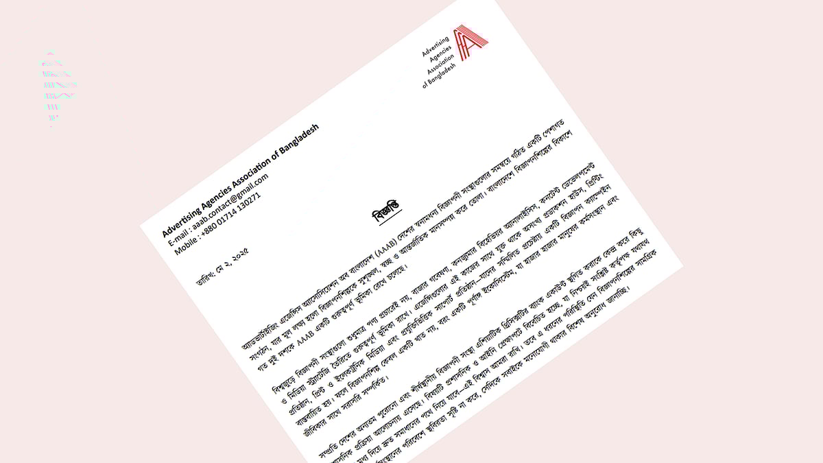 এএএবির সংবাদ বিজ্ঞপ্তিতে বলা হয়, ‘যেহেতু বহু আন্তর্জাতিক ও স্থানীয় প্রতিষ্ঠান বাংলাদেশের বিজ্ঞাপনী সংস্থার ওপর নির্ভরশীল, তাই যেকোনো দীর্ঘমেয়াদি অচলাবস্থা দেশের অর্থনৈতিক ও সামগ্রিক ভাবমূর্তির ওপর বিরূপ প্রভাব ফেলতে পারে। আমরা আশাবাদী, সংশ্লিষ্ট কর্তৃপক্ষ ও অংশীজনদের দূরদর্শিতায় এ ধরনের বিষয়গুলোর সুচিন্তিত ও সময়োপযোগী সমাধান বেরিয়ে আসবে।’