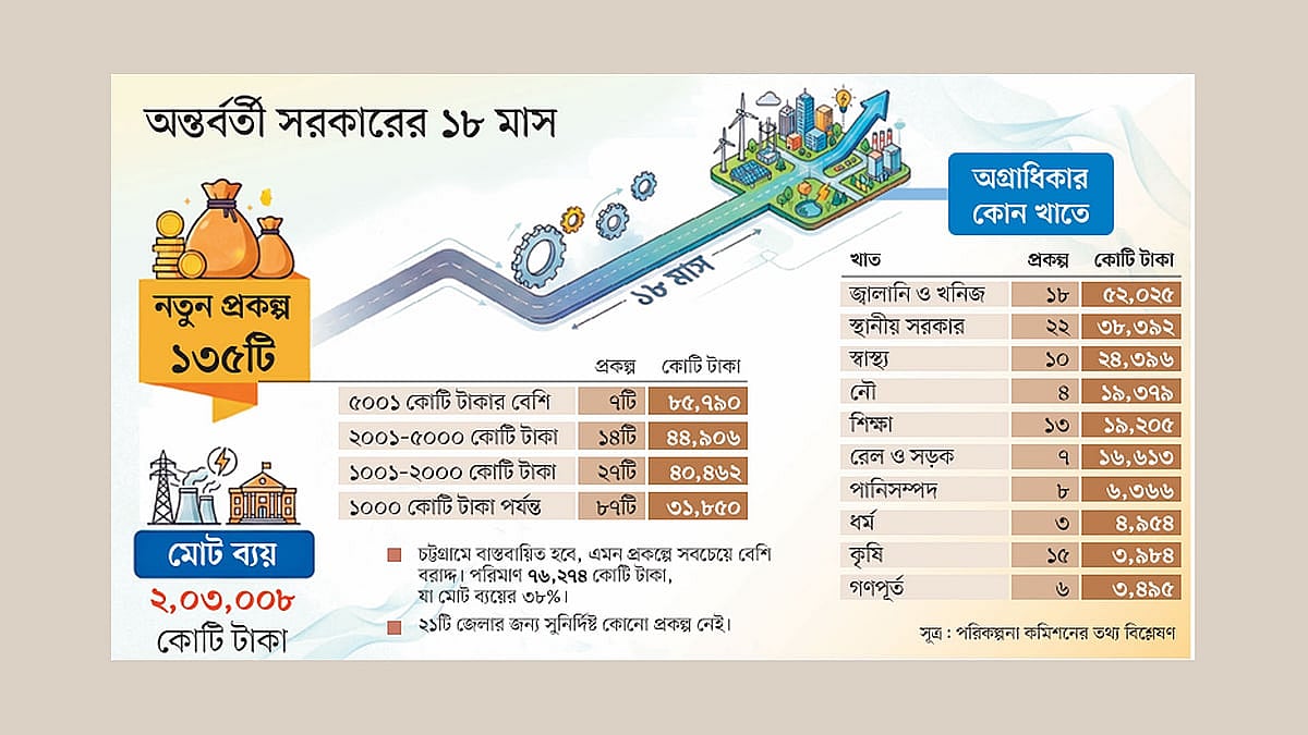 অধ্যাপক মুহাম্মদ ইউনূসের নেতৃত্বাধীন অন্তর্বর্তী সরকারের শেষ সময়ে (১ ডিসেম্বর থেকে ২৫ জানুয়ারি) ৬৪টি প্রকল্প অনুমোদন হয়েছে। যেগুলোর মোট ব্যয় ১ লাখ ৬ হাজার ৯৯৩ কোটি টাকা। এর মধ্যে ৪০টি নতুন প্রকল্প। এসব প্রকল্প বাস্তবায়নে ব্যয় হবে ৭৯ হাজার ৩৫৬ কোটি টাকা। নতুনের তালিকায় প্রয়োজনীয় প্রকল্প যেমন রয়েছে, তেমনি রয়েছে ‘কম জরুরি’ ও ‘বিতর্কিত’ প্রকল্প।