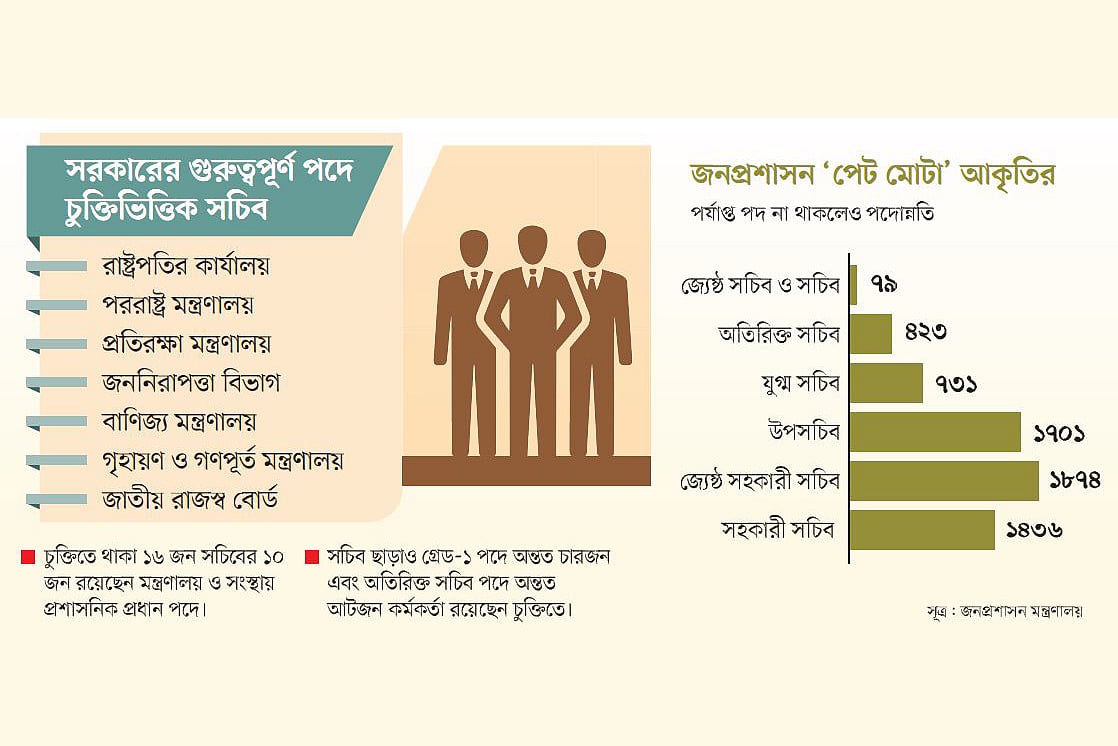 চুক্তিভিত্তিক সচিব রয়েছেন অন্তত ১৬ জন। পুলিশেও চুক্তিতে নিয়োগ। জনপ্রশাসনে আরেকটি বড় পদোন্নতিও আসছে।