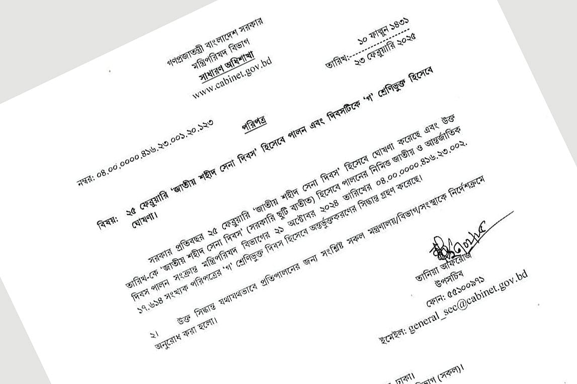পরিপত্রে ২৫ ফেব্রুয়ারিকে ‘জাতীয় শহীদ সেনা দিবস’ হিসেবে যথাযথভাবে পালনের জন্য সংশ্লিষ্ট সব মন্ত্রণালয়, বিভাগ, সংস্থাকে অনুরোধ জানানো হয়।