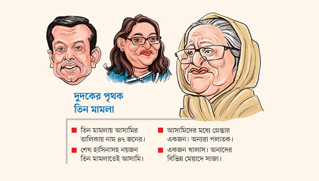 দুর্নীতি দমন কমিশনের (দুদক) করা পৃথক ওই তিন মামলার প্রতিটিতে শেখ হাসিনা আসামি। প্রতিটি মামলায় তাঁকে ৭ বছর করে মোট ২১ বছরের কারাদণ্ড দিয়েছেন আদালত। একই সঙ্গে প্রতিটি মামলায় তাঁকে এক লাখ টাকা করে মোট তিন লাখ টাকা অর্থদণ্ড দেওয়া হয়েছে।