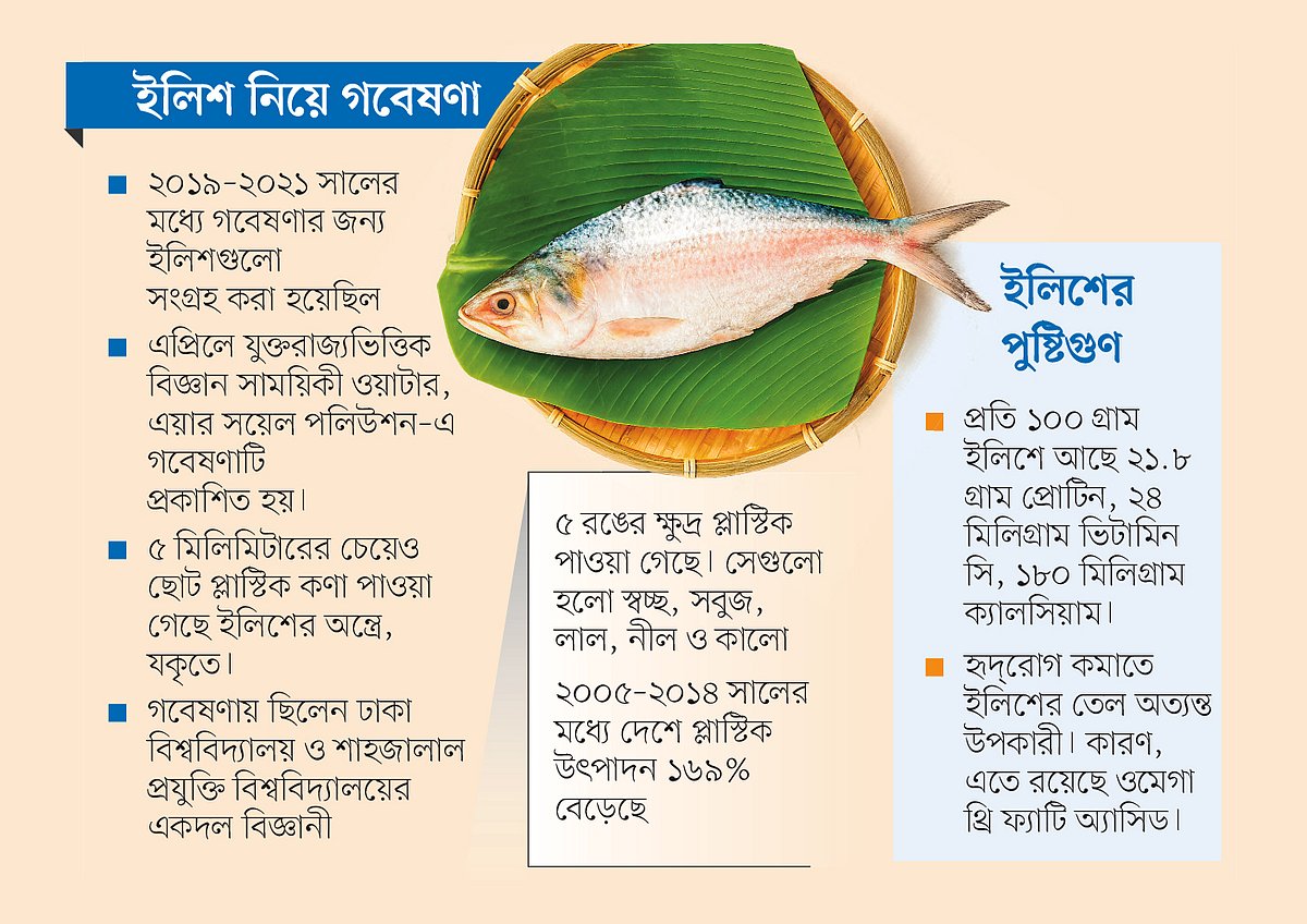সাম্প্রতিক এক গবেষণায় দেখা যাচ্ছে, বাংলাদেশের নদীমুখে ধরা ইলিশে পাওয়া গেছে মাইক্রোপ্লাস্টিক কণা। শুধু তা-ই নয়, ইলিশের শরীরে বাসা বেঁধেছে ক্যাডমিয়াম, সিসা, পারদ, আর্সেনিকের মতো ভারী ধাতু।