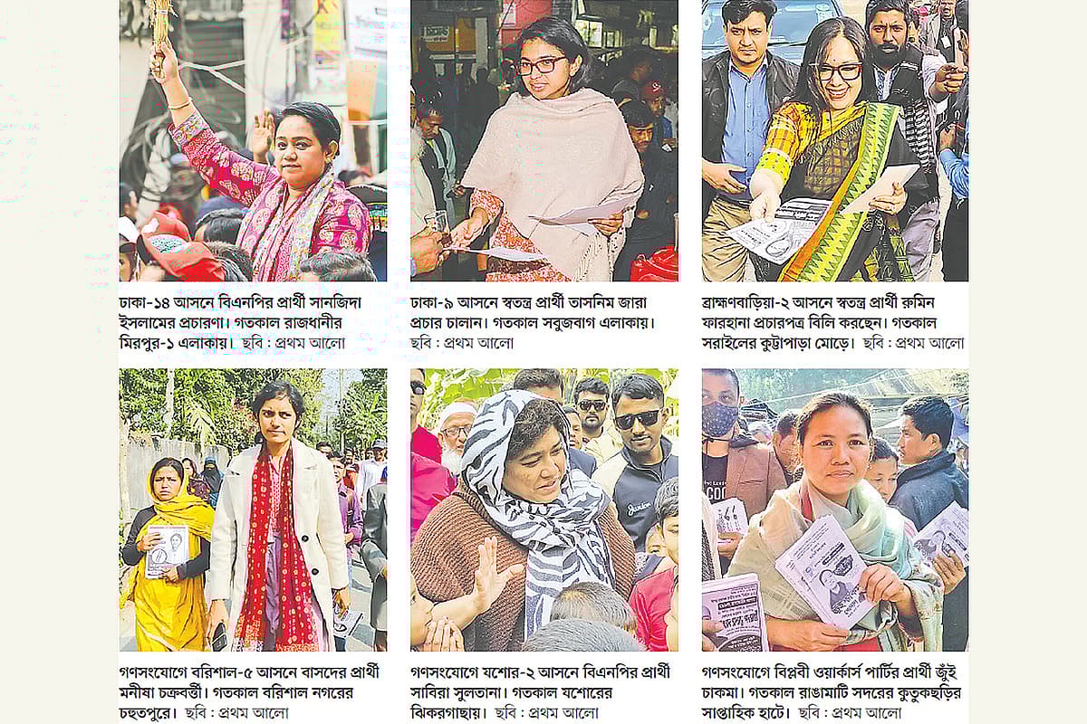 এবার জাতীয় সংসদ নির্বাচনে মোট ৭৮ জন নারী বিভিন্ন দলের ও স্বতন্ত্র প্রার্থী হিসেবে প্রতিদ্বন্দ্বিতা করছেন। তাঁদের অনেকেই প্রচারে নেমে ইতিমধ্যে সাধারণ মানুষের নজর কেড়েছেন। সানজিদা ইসলাম, তাসনিম জারা, রুমিন ফারহানা, মনীষা চক্রবর্তী, সাবিরা সুলতানা ও জুঁই চাকমাসহ আরও অনেক নারী প্রার্থী ভোটের মাঠ চষে বেড়াচ্ছেন দিন-রাত। যাচ্ছেন ভোটারদের দুয়ারে দুয়ারে।