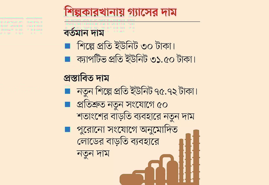 শিল্পকারখানায় দুই ধরনের গ্যাস–সংযোগ আছে। একটি হলো কারখানার বয়লার চালাতে নেওয়া হয়। আর বড় কারখানায় নিজস্ব বিদ্যুৎ উৎপাদনের জন্য ক্যাপটিভ সংযোগ। দুটি সংযোগের ক্ষেত্রে প্রতি ইউনিট গ্যাসের দাম এখন একই। পেট্রোবাংলার প্রস্তাবে বলা হয়েছে, পুরোনো গ্রাহকের ক্ষেত্রে অনুমোদিত লোডের বাড়তি ব্যবহৃত গ্যাসের বিল হবে নতুন দামে। যেসব শিল্পকারখানা নতুন সংযোগের প্রতিশ্রুতি পেয়েছে, তাদের ক্ষেত্রে অনুমোদিত লোডের ৫০ শতাংশ পর্যন্ত আগের দাম দিতে হবে। এর বাইরে বাকিটুকুর জন্য নতুন দাম প্রস্তাব করা হয়েছে।