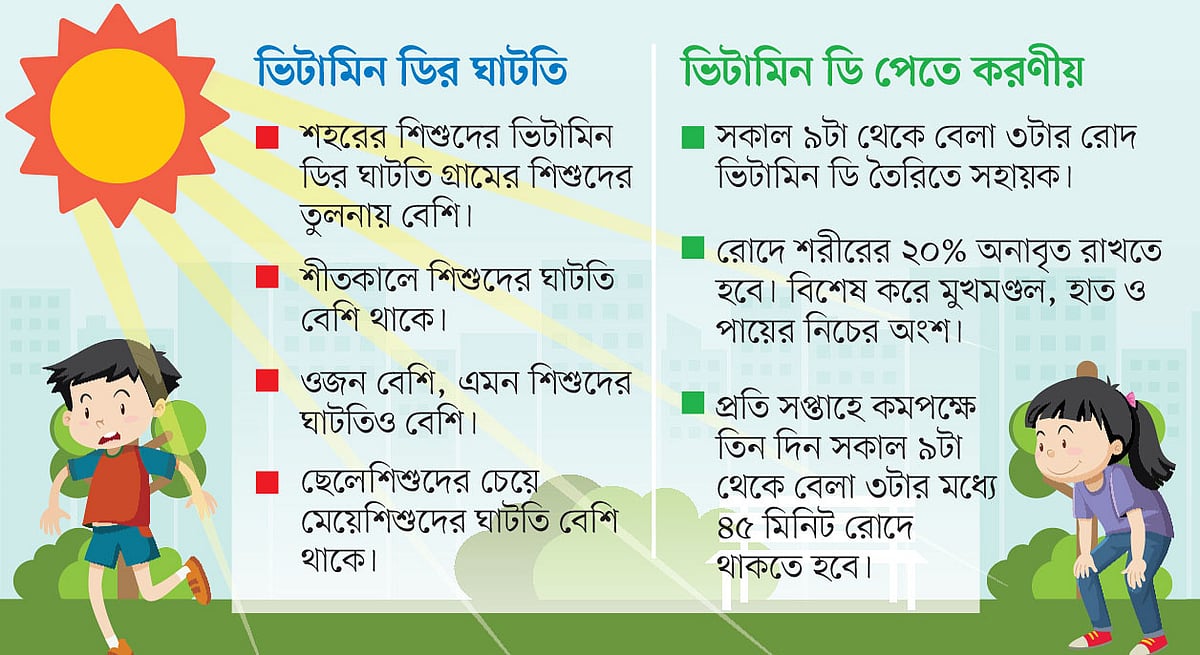ভিটামিন ডি কম থাকা শিশু শহরে বেশি। গবেষণায় দেখা গেছে, শহরের ৭৯ দশমিক ৯ শতাংশ শিশুর এই ঘাটতি আছে। গ্রামে এই হার ৪৩ দশমিক ৬ শতাংশ। অন্যদিকে বয়স অনুপাতে যেসব শিশুর ওজন বেশি, তাদের ভিটামিন ডির ঘাটতিও বেশি।