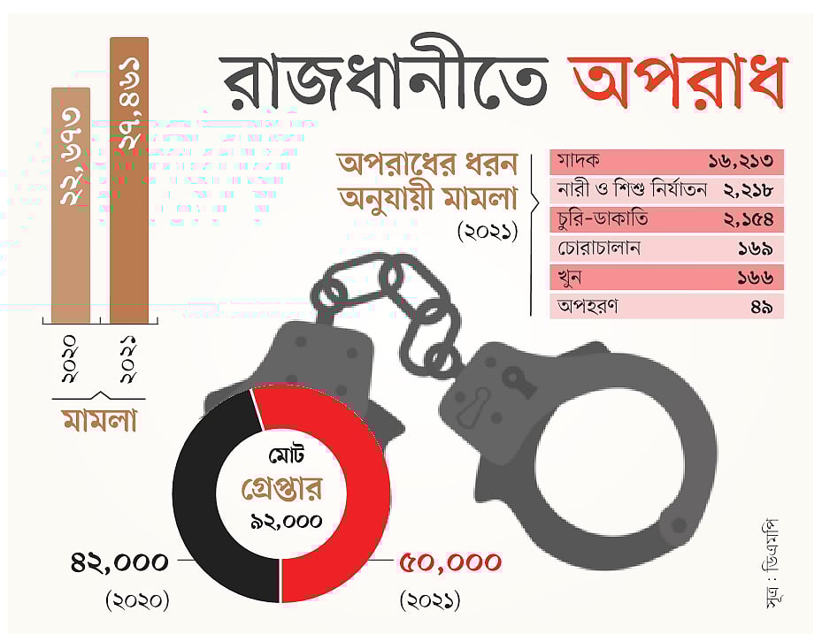 বিভিন্ন অপরাধে ২০২১ সালে সব মিলিয়ে গ্রেপ্তার করা হয় ৫০ হাজারের মতো ব্যক্তিকে। আগের বছর সংখ্যাটি ছিল ৪২ হাজার ৩৬৯। ওই বছর ডিএমপিতে ২২ হাজার ৬৭৩টি মামলা হয়। ডিএমপির হিসাব বলছে, রাজধানীতে অপরাধ দমন করতে গিয়ে ২০২১ সালে ৬৯ পুলিশ আক্রান্ত হয়েছে।