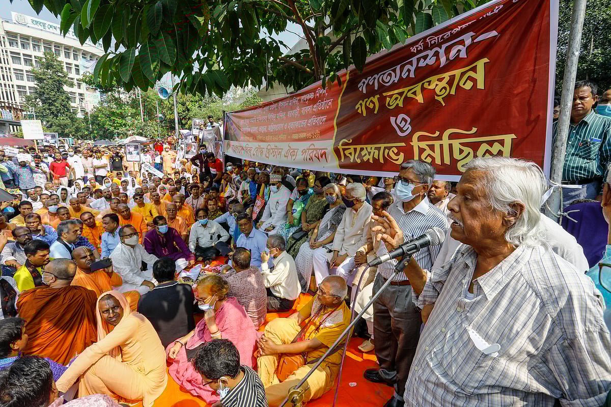 অবস্থান কর্মসূচিতে হিন্দু বৌদ্ধ খ্রিস্টান ঐক্য পরিষদের সভাপতি নিমচন্দ্র ভৌমিক বলেন, ‘কুমিল্লা, চাঁদপুর, নোয়াখালীসহ সারা দেশের বিভিন্ন জায়গায় হিন্দু সম্প্রদায়ের ওপর হামলা হয়েছে। এ হামলার বিচারের দাবিতে গণ–অনশনের মূল দাবি হলো এর দৃষ্টান্তমূলক শাস্তি চাই। মুক্তিযুদ্ধের পক্ষের শক্তির সরকার থাকা সত্ত্বেও এর আগে রামু, নাসিরনগর, রংপুরসহ বিভিন্ন এলাকায় হামলা হয়েছে। এসব হামলার প্রতিকারে কিছু ব্যবস্থা নেওয়া হলেও দৃষ্টান্তমূলক শাস্তি হয়নি। তিনি বলেন, সারা দেশে পরিকল্পিতভাবে সংখ্যালঘুদের ওপর হামলা হয়েছে। পরিকল্পিত না হলে পরপর বিভিন্ন এলাকায় এ ধরনের হামলা হতে পারে না।’