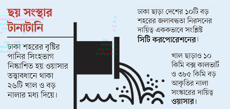 ঢাকা শহরের বৃষ্টির পানির সিংহভাগ নিষ্কাশিত হয় ওয়াসার তত্ত্বাবধানে থাকা ২৬টি খাল ও বড় নালার মধ্য দিয়ে। খাল ও নালা খনন, রক্ষণাবেক্ষণ এবং সংস্কারের দায়িত্ব এই সংস্থার। কিন্তু ওয়াসা ঠিকমতো খাল ও নালা পরিষ্কার করে না, এ অভিযোগ সিটি করপোরেশনের। আর ওয়াসা বলছে, সিটি করপোরেশন যথাযথভাবে আবর্জনা সংগ্রহ না করায় নালা ও খালে আবর্জনা জমে থাকে। এতে পানিনিষ্কাশনের পথ বন্ধ হয়ে যায়।