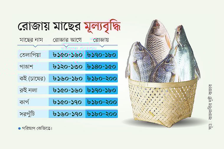এই বাজারে গতকাল তেলাপিয়া ১৭০-১৮০ টাকা কেজি বিক্রি করতে দেখা গেছে। রোজা শুরুর আগেও তা ১৫০-১৬০ টাকায় বিক্রি হয়েছিল। এ ছাড়া ১২০-১৩০ টাকায় বিক্রি হওয়া পাঙাশ মাছ গতকাল ১৪০-১৫০ টাকা, ১৬০-১৮০ টাকায় বিক্রি হওয়া কই (চাষের) ১৮০-২০০ টাকায় বিক্রি করা হয়। ছোট আকারের রুই (নলা) ১৭০-১৮০ টাকায়, কার্প মাছ ১৮০-২০০ টাকায় এবং সরপুঁটি ১৮০-২০০ টাকা কেজি বিক্রি করা হয়।